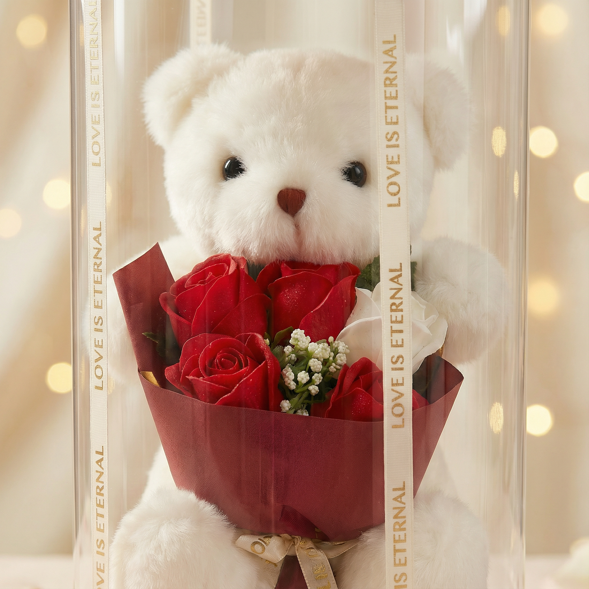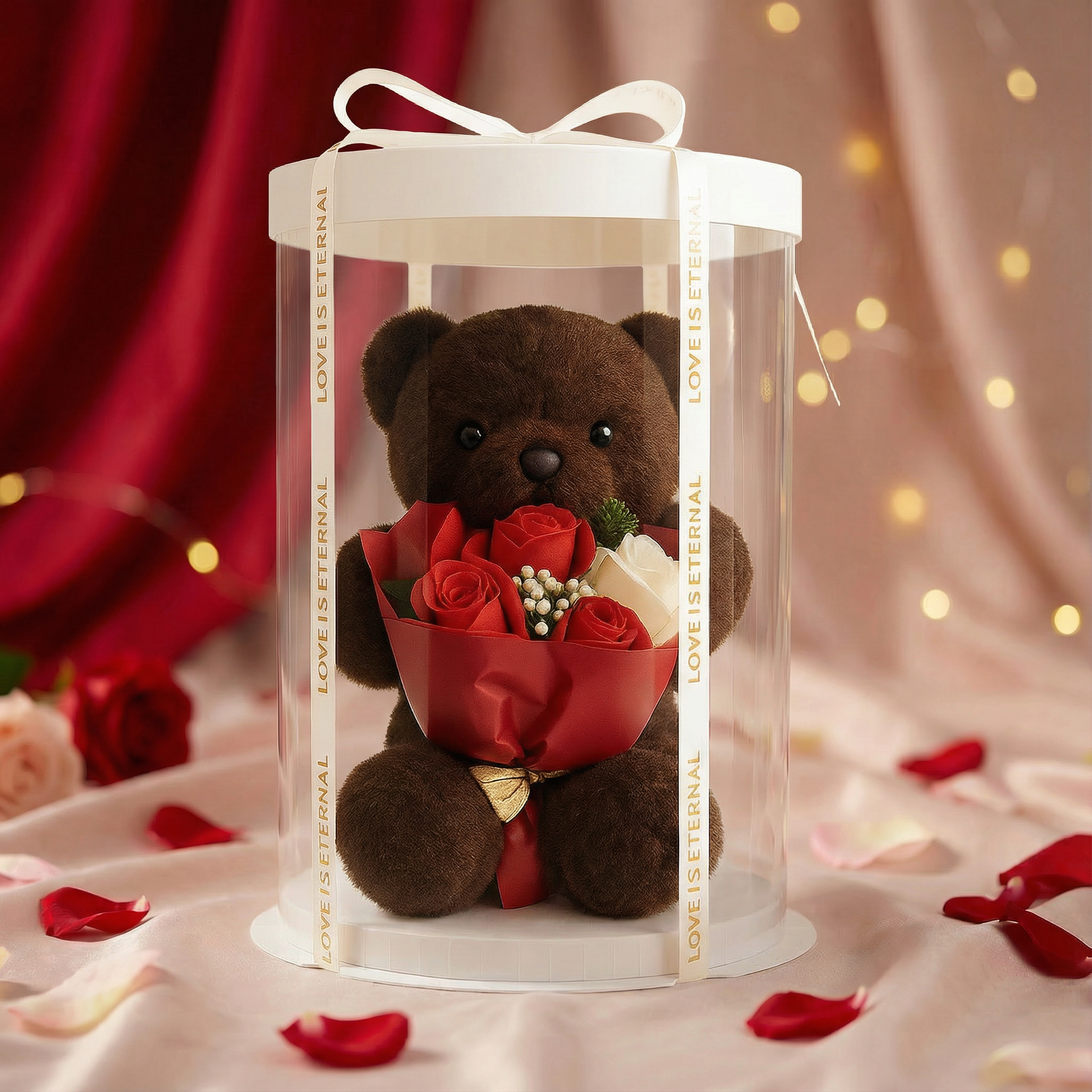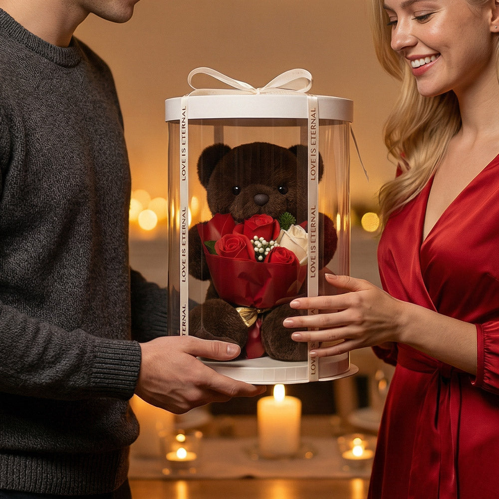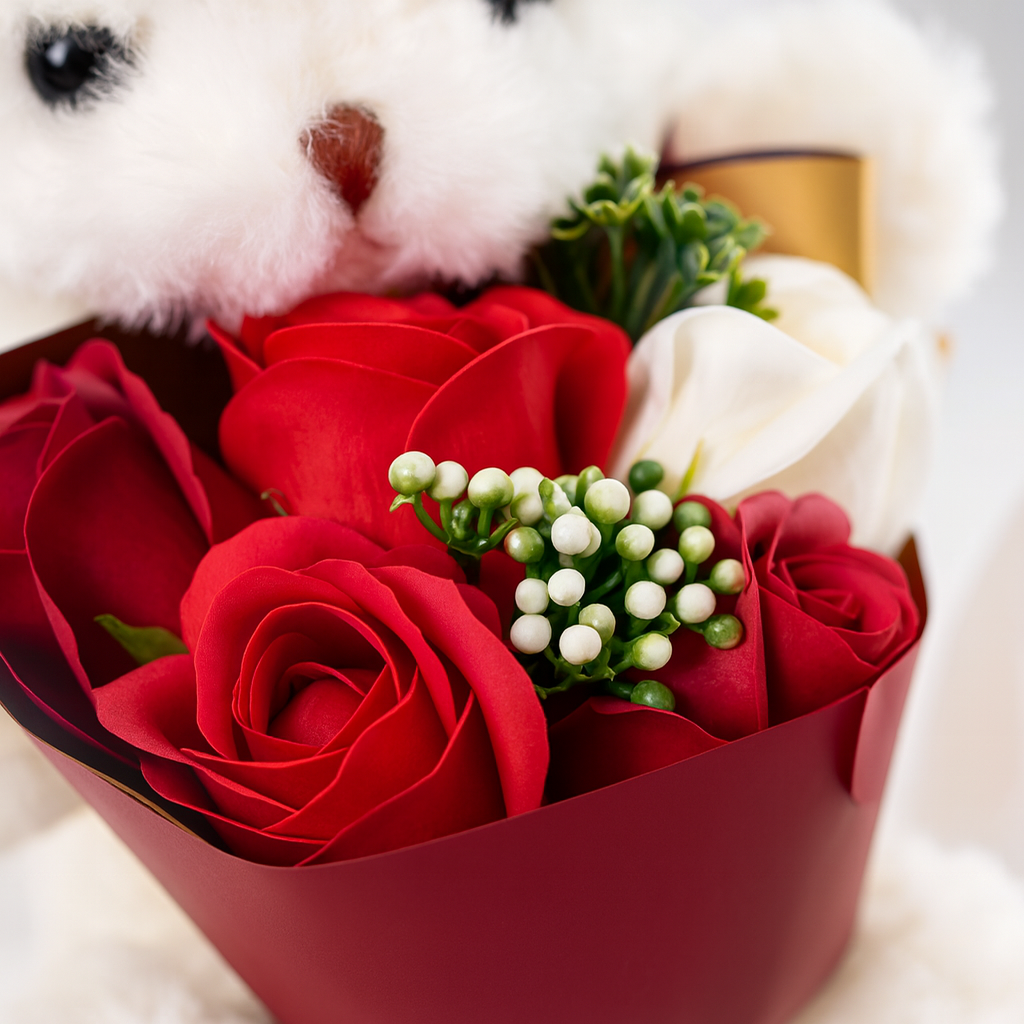 Miś z bukietem mydlanych róż zapakowany w eleganckie pudełko