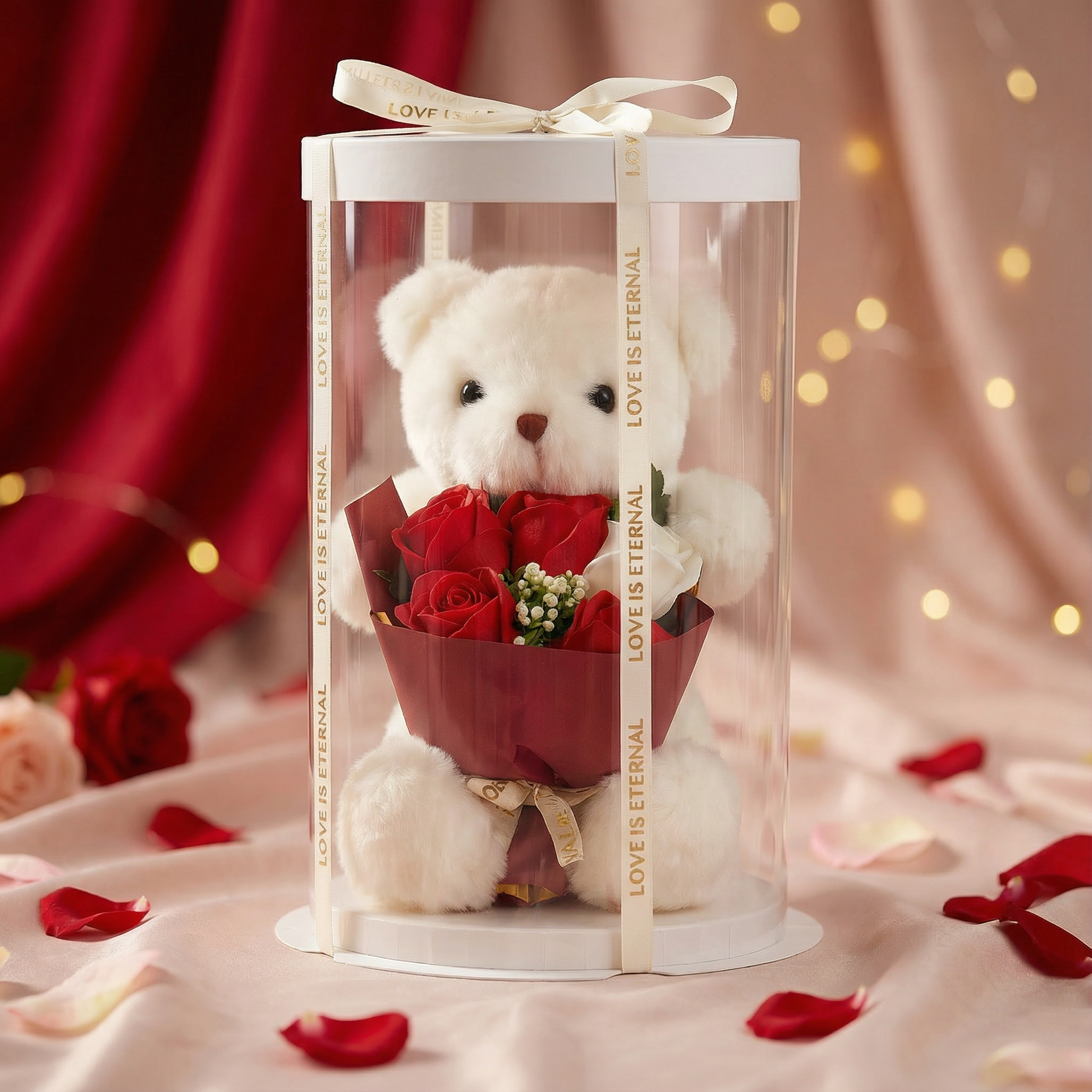 Luksusowe opakowanie: Elegancki przezroczysty cylinder z ozdobną wstążką – gotowy do wręczenia bez dodatkowego pakowania.